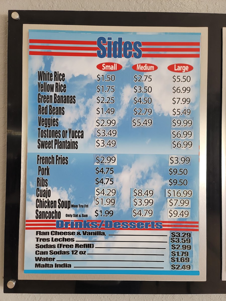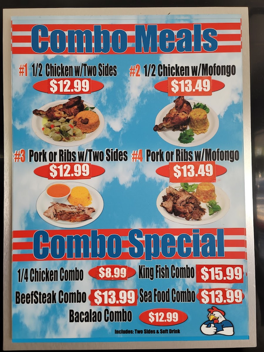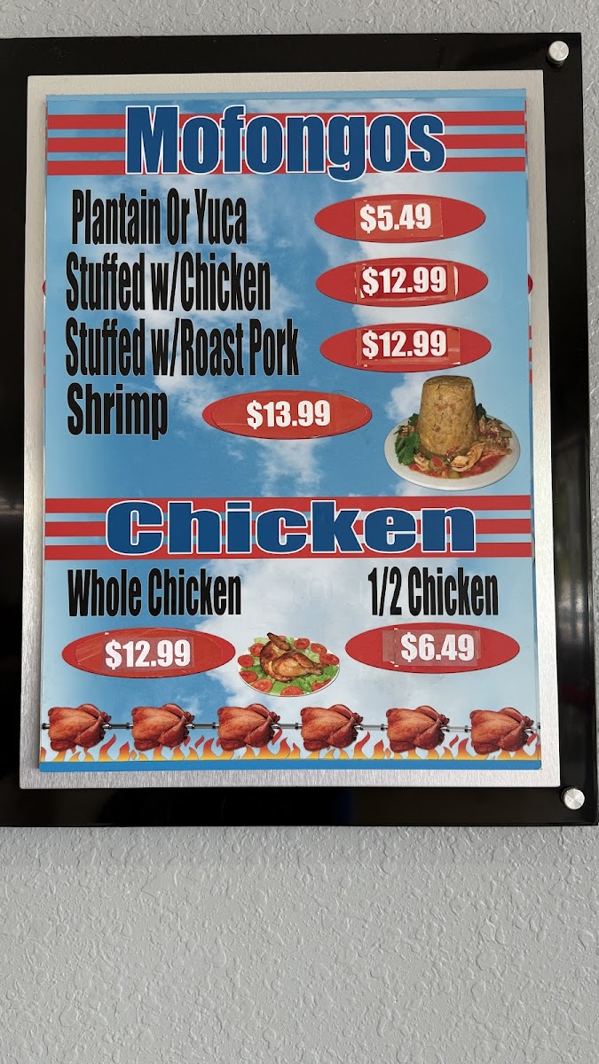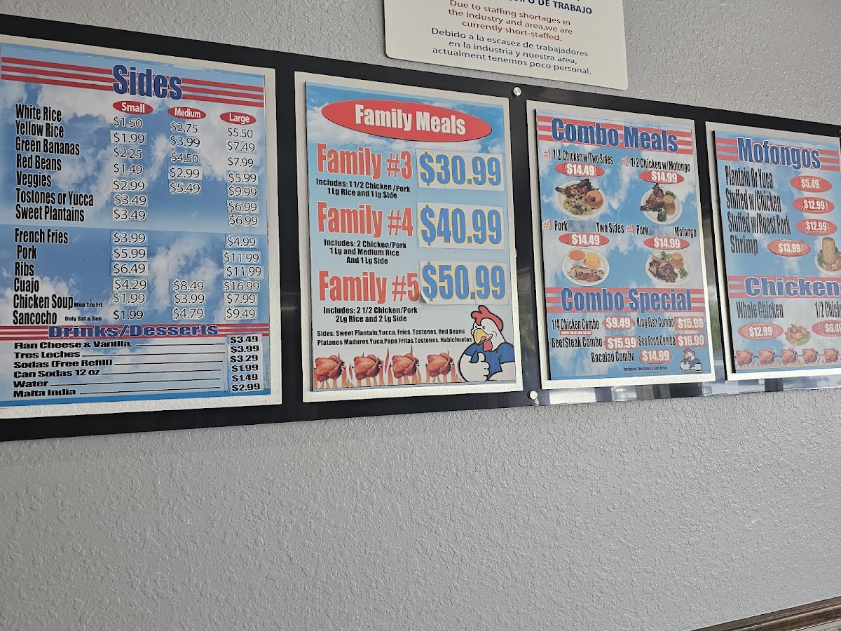 Guests can expect classic staples like rotisserie chicken served alongside mofongo or yellow rice and beans. Options such as arroz con gandules with carne guisada and maduros bring familiar homestyle warmth, while sandwiches like the Cuban and fish sandwich provide a convenient and flavorful choice for those on the go. The menu also includes a variety of protein-focused dishes like BBQ ribs, churrasco beef, and camarones al ajillo, catering to diners seeking both traditional tastes and a bit of variety.